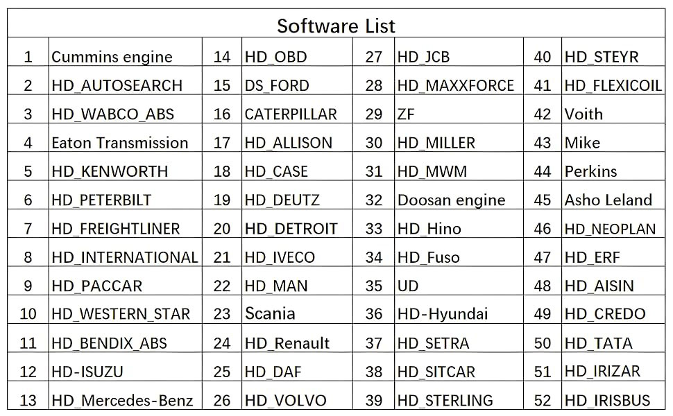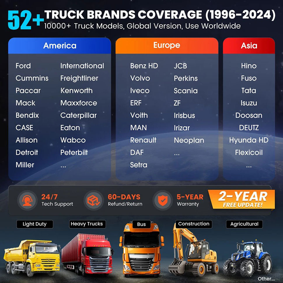 7. Broad Truck Coverage. works well on 52+ makes, covering over US, Asian and European commercial vehicle makes,work for 12V &24 V with no extra FEE,FOR Cars,Trucks, buses, Trailers, Excavators, Diesel engine, Construction machinery, Pick-up, Hybrid vehicle,etc.