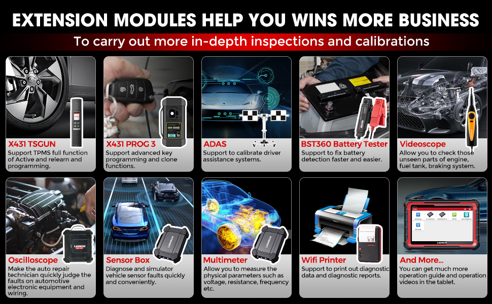8. Extenion Modules Supported (ADAS, VideoScope, Sensor Box, Oscilloscope, Battery tester, Wifi Printer, i-TPMS, XPROG3, etc)