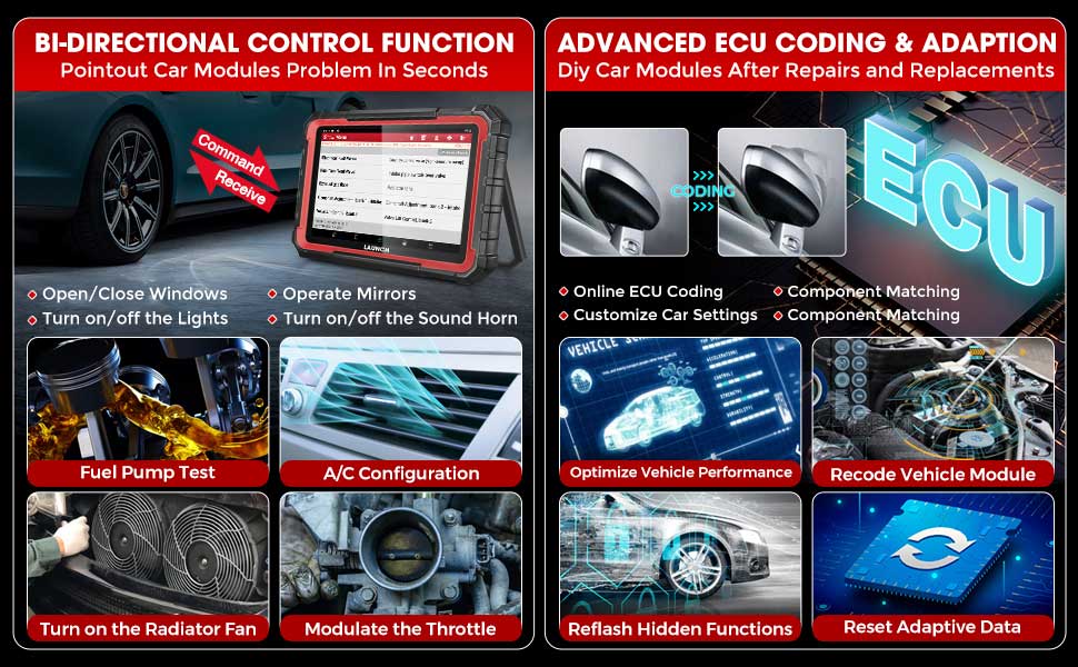 LAUNCH X431 PRO ELITE has the advanced ECU Coding & Online Coding function to cover more car models, including the old & new models without extra cost. With the ECU coding function, it can to Match, learn, or code the newly replaced ECU, update the vehicle ECU software, refresh hidden features to disable annoying functions, like disabling seat belt beep, and daylight running light, and Match certain components after repairs or replacements and Reprograms the adaptive data for certain components after repairs or replacements and help professional mechanics/technicians to do vehicle repairs. Customize the cars fast, have greater work efficiency, and meet customer needs.