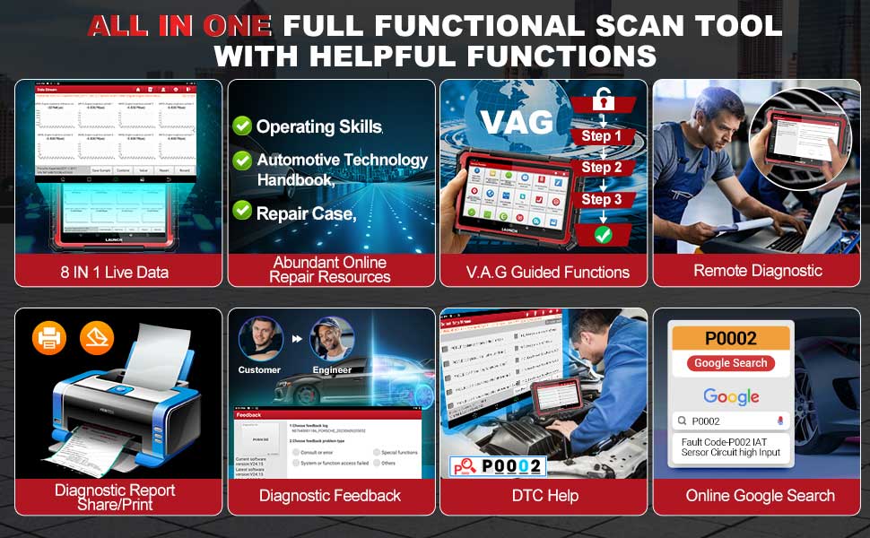 7. Remote Diagnosis+One Click to Check System & Clear Fault Code & Health Report+Online Feedback Diagnosis: This launch x431 pro elite can support Tech to Tech or the user’s friends to perform remote assistance; With the “Automatic search” or “System selection” function, you can both auto or manually select the system to be checked. “Health Report” function enables users to quickly detect fault codes in all systems and clear all fault codes in every system of the vehicle with one click, making the diagnostic process smarter and more efficient. 8 in 1 Live Data Graphing makes more Intuitive. In addition, you can save and share the fault codes report by utilizing the “Report” function. - All-In-One LAUNCH X431 PRO ELITE scanner with the following ADVANCED OE-LEVEL FUNCTIONS: