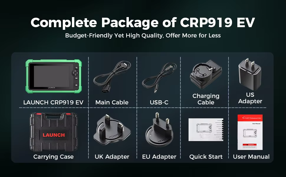 LAUNCH CRP919 EV is an intelligent and networkable diagnostic tool based on the Android platform, with full system and full functions that best meet the needs of the new energy DIY market. It covers software for more than 120 models. The functions of the product include code reading, code clearing, version information, data stream reading, action test, and coding. It also has 38 special functions and 2 battery packs.