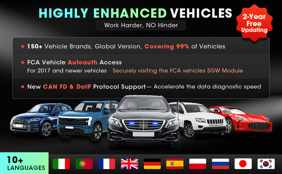 Functionality and coverage are often important considerations when shopping for diagnostic tools. LAUNCH CRP919X auto scan tool comes with wider coverage and clears all your concerns on vehicle compatibility. Its diagnostics apply to global 100+ vehicle brands and 10000+ vehicle models (1996-2024). The high-frequency data updating per 3 months on average will also optimize the abundant database and load more data on newly released vehicle models (updating to 2023). Never be out of date.