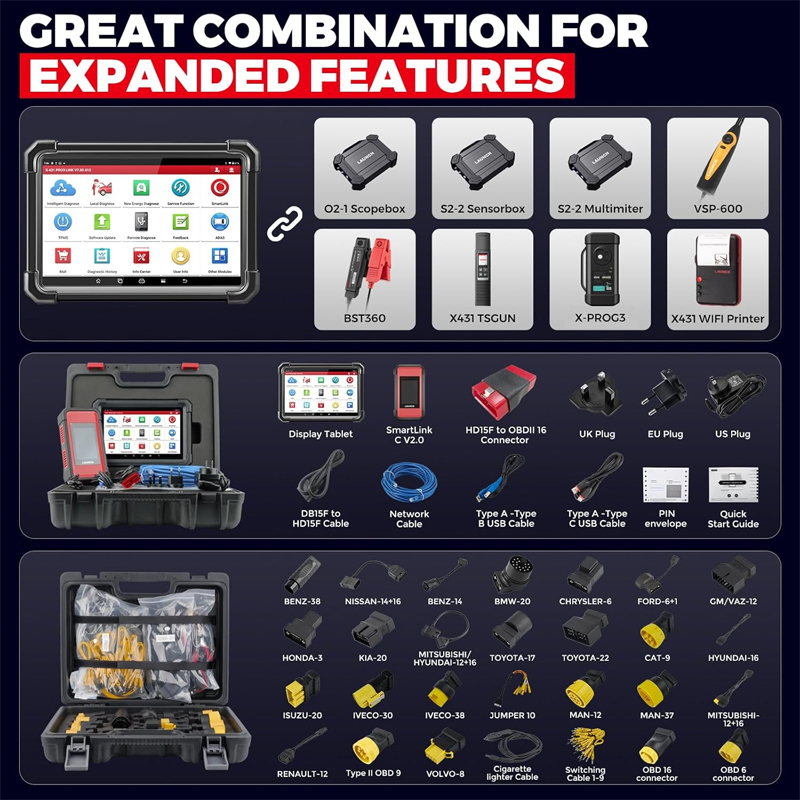 - 1pc x X431 PRO3S+ SmartLink HD1pc x SmartLink C V2.06pcs x fuses9pcs x jumpers1pc x Jumper 101pc x OBD16 connector1pc x IV 30 connector1pc x Type II OBD9 connector1pc x OBD6 connector1pc x CAT9 connector1pc x BENZ 14 connector1pc x RENAULT 12 connector1pc x ISUZU 20 connector1pc x VOLVO 8 connector1pc x MAN 12 connector1pc x MAN 37 connector1pc x IVECO 38 connector1pc x HY-16 cable1pc x M/F 12+16 cable1pc x USB cable1pc x Test cable1pc x Type C to USB cable1pc x standard power adapter1pc x OBD main cable1pc x power cable clips1pc x lighter1pc x For K-20 adapter1pc x For HA-3 adapter1pc x For G/V-12 adapter1pc x For FD-6+1 adapter1pc x For CR-6 adapter1pc x For TA-17 adapter1pc x For TA-22 adapter1pc x For NN-14+16 cable1pc x For MH-12+16 cable1pc x For B-20 adapter1pc x For BZ-38 adapter1pc x For BZ-14 adapter