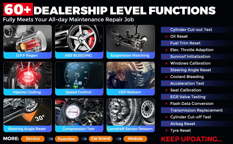 - Supports 60 special functions such as maintenance light reset, throttle matching, steering angle reset, brake pad reset, tire pressure reset, etc.